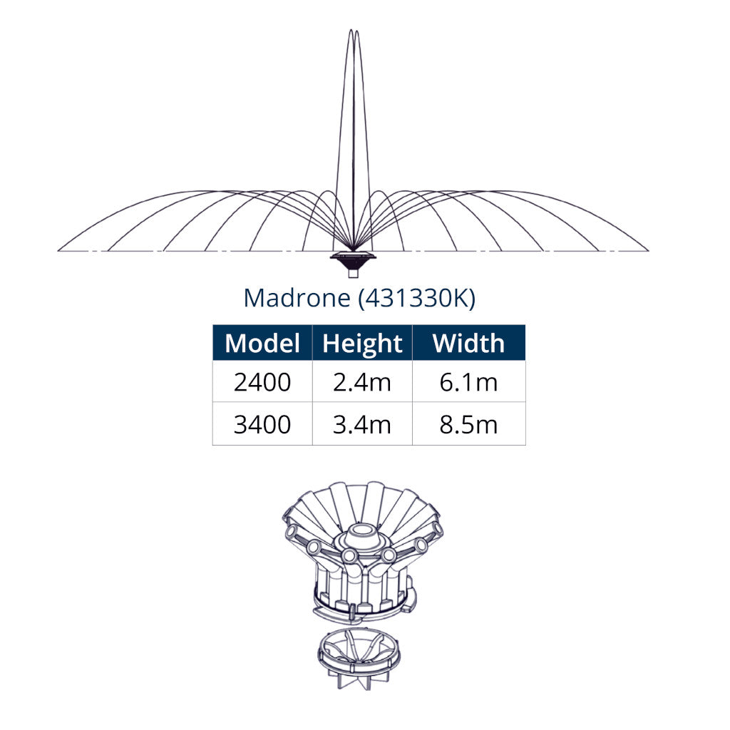 The Kasco Madrone Premium Fountain Nozzle 1/2HP - 3/4HP is an optional alternative fountain pattern for the smaller 1/2HP - 3/4HP Kasco Floating Aerating Fountains.